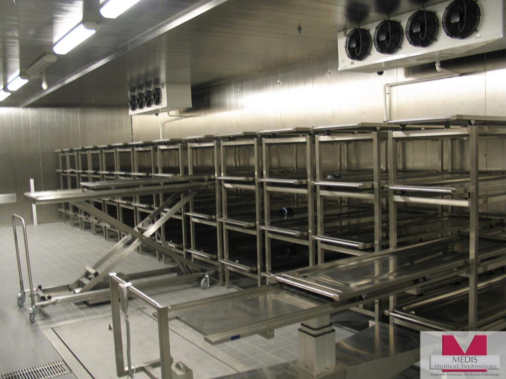 Die Vorgaben der Nutzer / Planer war die schnelle Lagerung von ca. 100 Leichen in Verbindung mit einem großen Präpariersaal und einer im Boden eingelassenen Waage zur Gewichtsdokumentation. Die Bestückung der Lagerfächer erfolgt durch elektrisch höhenverstellbare Hubwagen.
